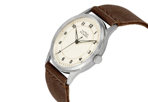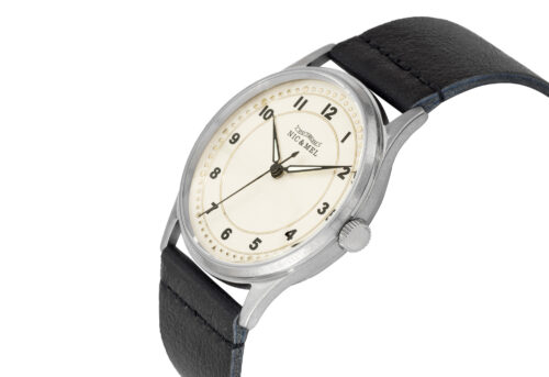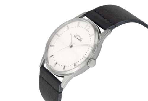 Kennedy wristwatch is a solid watch made of stainless steel. It has a round white face, with silver and white hands. The watch has a raised bezel made of glass.